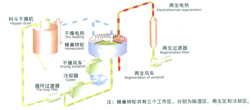 该系统除湿机采用蜂巢转轮式结构设计具有空间小、吸湿能力强、露点低、使用寿命长等优点。采用P.I.D.温度控制系 统,可控制温度。并可选购可编程控制器搭配液晶显示面作为整个系统的中央操作站,人性化的操作与控制,人员控管 方便。另外该机还可以选购露点侦测仪对整个系统所产生的干燥风做全天候的侦测,以确保本设备能提供合格的干 燥原料。经由该蜂巢转轮式除湿机处理过后的干燥风露点可达到零下50°C。