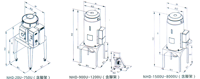 NHD-U系列下吹式欧化料斗干燥机料斗采用不锈钢制造,配备有“热气下吹”及“旋风排气”功能及双层保温桶,特别 适合搭配除湿机用来干燥工程塑料。该系列能提供的装料容量由20至8000公升,共分为25种机型。该产品除了与原料接触的 零件以外,连与热风产生接触的部分也都采用不锈钢制造,配备有保温式的清洁门,同时全系列配备全数字微电脑控制,并 提供定时开关机的功能。