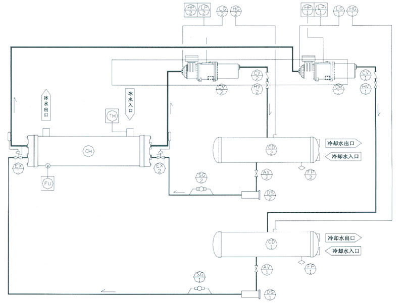 | 保护装置 | - | 高低压开关,防冻开关,可熔栓,压缩机热过载保护,电机温度过高保护,排气温度过高保护,水泵热过载保护,油温过高保护,逆却相保护,过欠压保护,冷却水温过离保护,冷冻水流量不足保护,冷却水流量不足保护,冷却塔风机过载保护等。 | |||||||||||