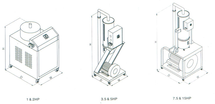 备注:1."NVH"表示电眼料斗;"NMH"表示真空料斗。 2.输送能力测试条件为:输送高度4m、输送距离1m。 3.机器电压规格为3φ, 380V,50Hz。 4.3.5HP以上机型附破真空阀。